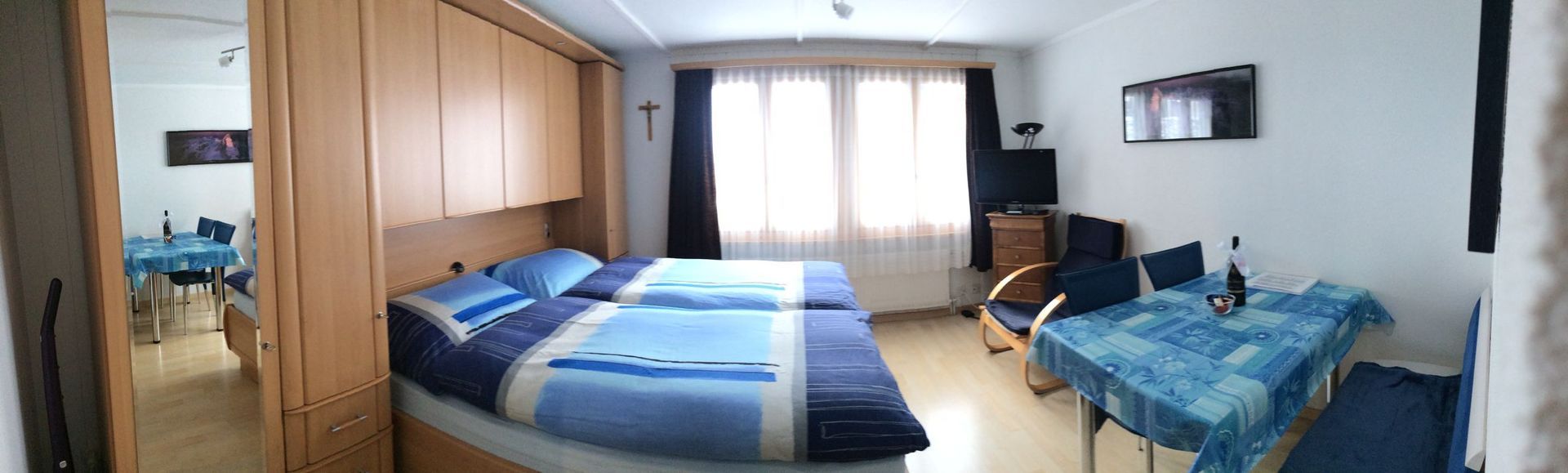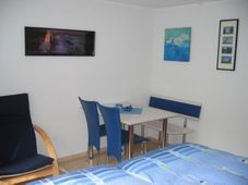 Wohn-Schlafzimmer mit 2 Betten mit einer gemütlichen Essecke.
